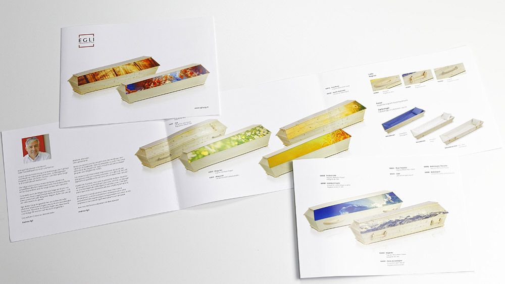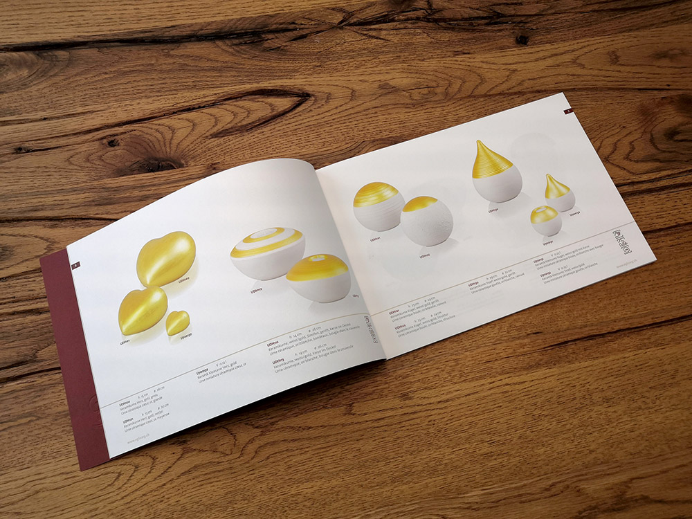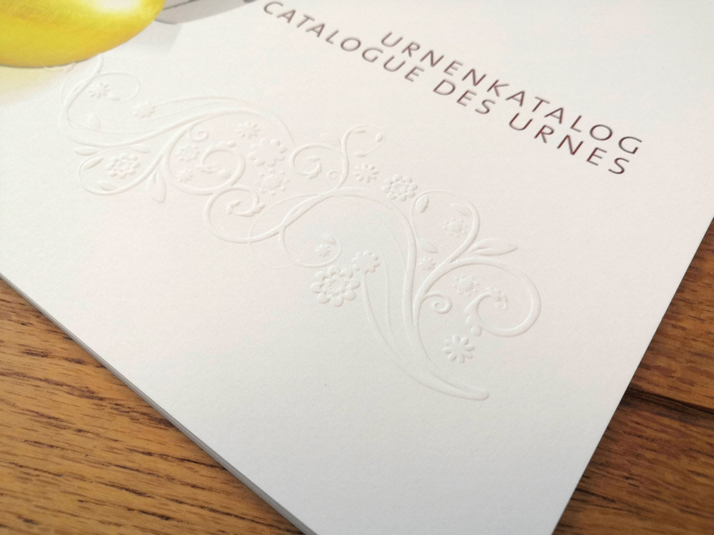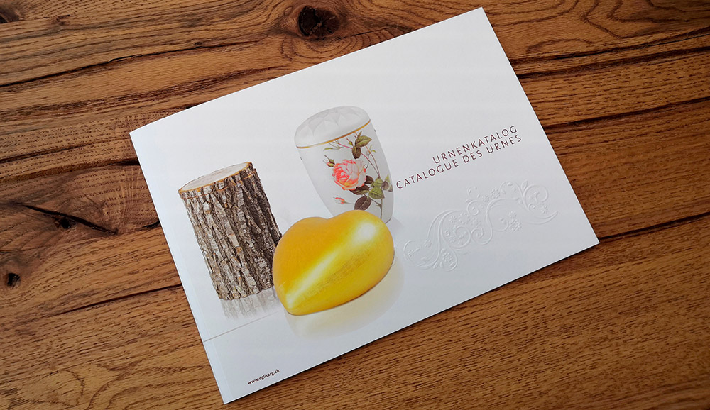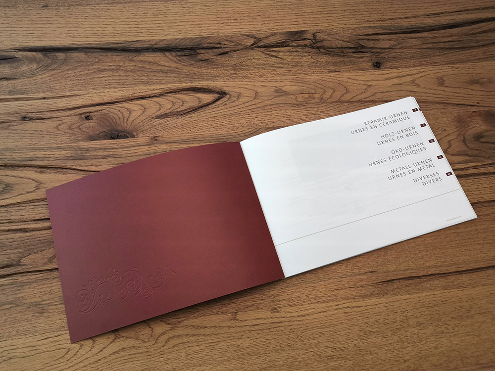 Eine Urne für die letzte Ruhe auszuwählen ist ein emotionaler Prozess. Der Katalog ist mit einem Papier produziert, das eine angnehme Haptik aufweist – die Druckart ist so gewählt, dass kein Farbauftrag das Papier überdeckt. Die sanften Farben und die Plindprägung auf der Titelseite vermitteln Geborgenheit und Seriosität.