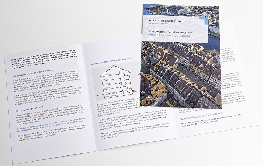 Die Gebäudeversicherung Luzern kann – nicht nur für die grafische Gestaltung der Jahresberichte – auf unsere langjährige Erfahrung zählen. Alle Kommunikationsmittel werden seit 2009 bei uns gestaltet.